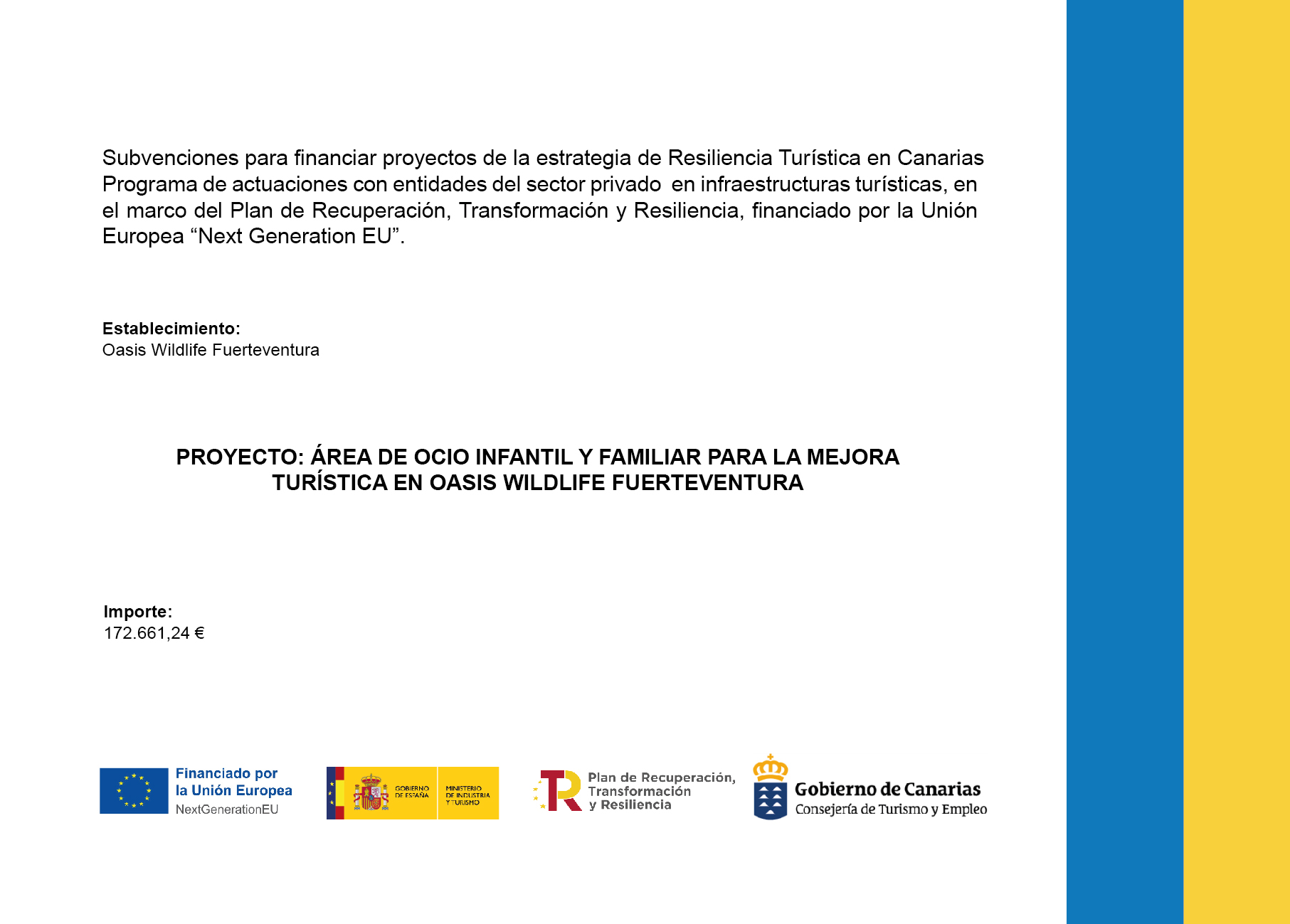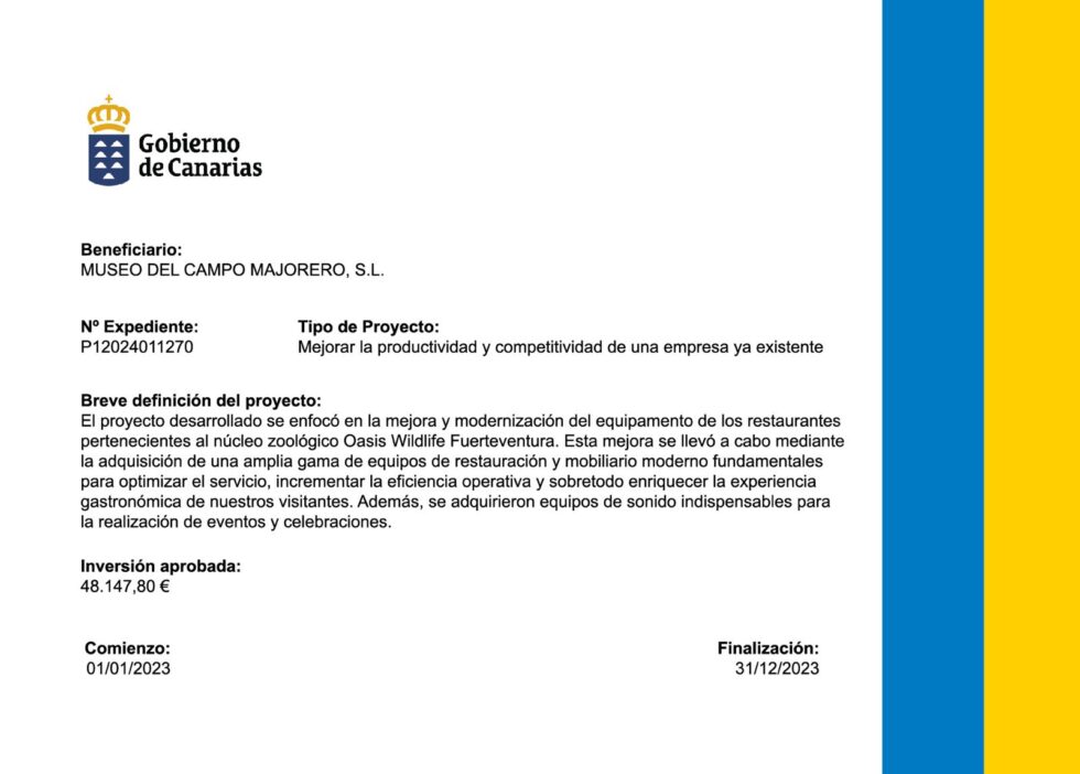 Proyecto de modernización de los espacios de restauración y de las áreas de trabajo en Oasis Widlife Fuerteventura, mediante la renovación del mobiliario, equipamiento y elementos de confort, con el objetivo de mejorar la calidad del servicio y el bienestar de visitantes y empleados.