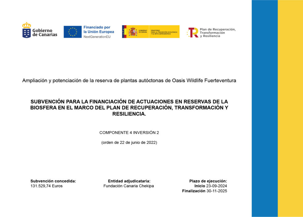 Subvención para la financiación de actuaciones en reservas de la biosfera en el marco del plan de recuperación, transformación y resiliencia. Proyecto para la ampliación y potenciación de la reserva de plantas autóctonas de Oasis Wildlife Furteventura.